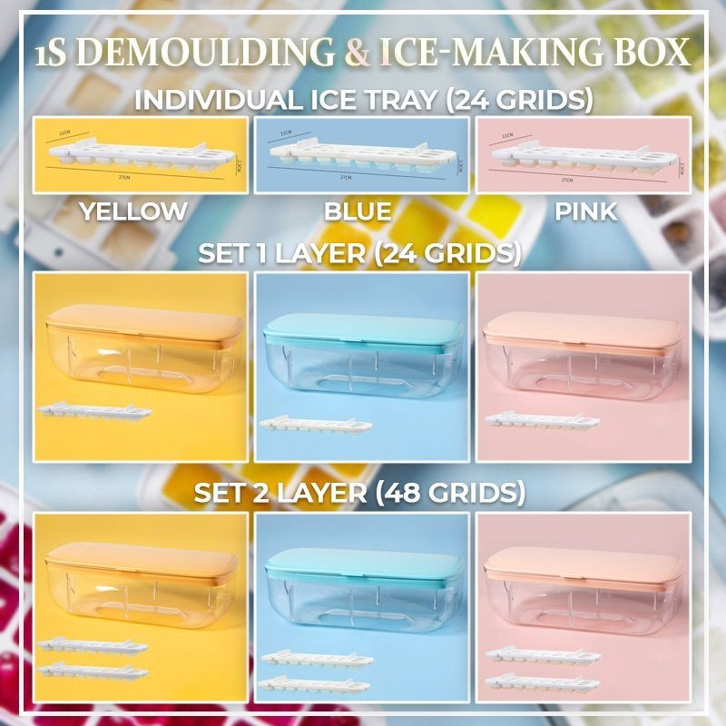 EASY RELEASE ICE MAKER?? The flexible Silicone Ice Tray makes uniform. The soft glue is buckled upside down and Pressed down to?remove the ice in 1s.?And?easy to clean.