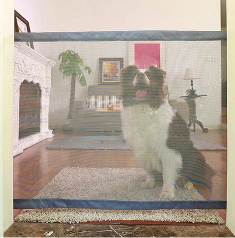 This pet safety enclosure is made from woven nylon mesh and features two stretchable poles and four sticky hooks. No tools required for installation!?