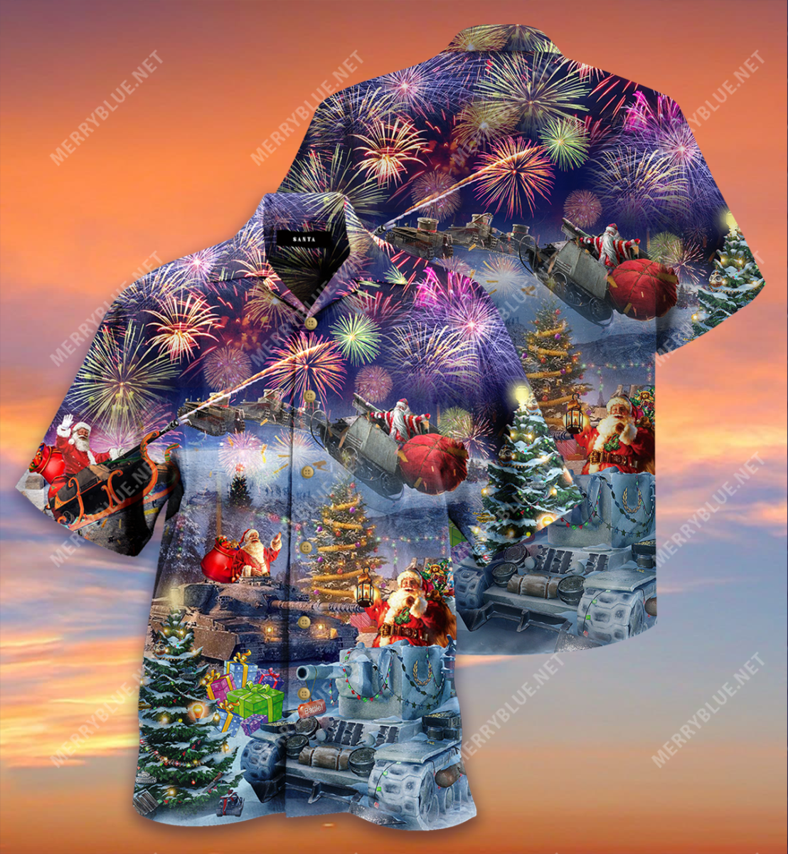 Santa Claus Rides Tank To Come Christmas Hawaiian Shirt Vacation Beach Shirt S-5XL