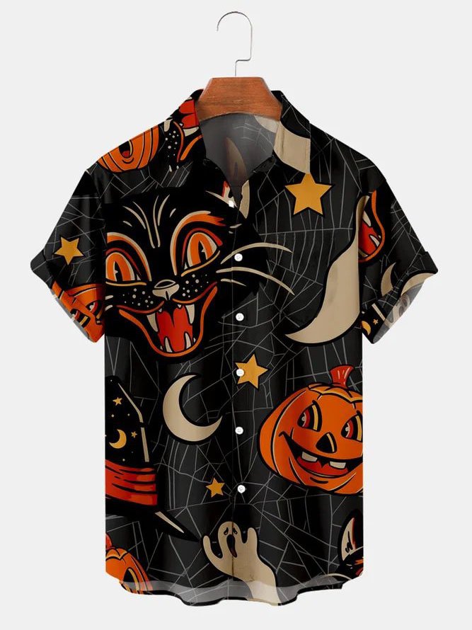 Halloween Pumpkin Cat Print Casual Hawaiian Shirt Scary Halloween Party Cat Lover Summer Beach Shirt
