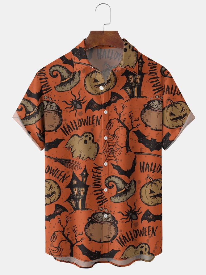 Halloween Print Short Sleeve Hawaiian Shirt Spooky Pumpkin Vintage Unique Beach Shirt
