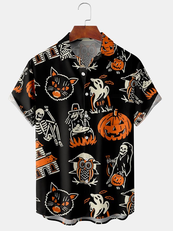Halloween Retro Cat and Witch Print Hawaiian Shirt Funny Pumpkin Vintage Halloween Gift