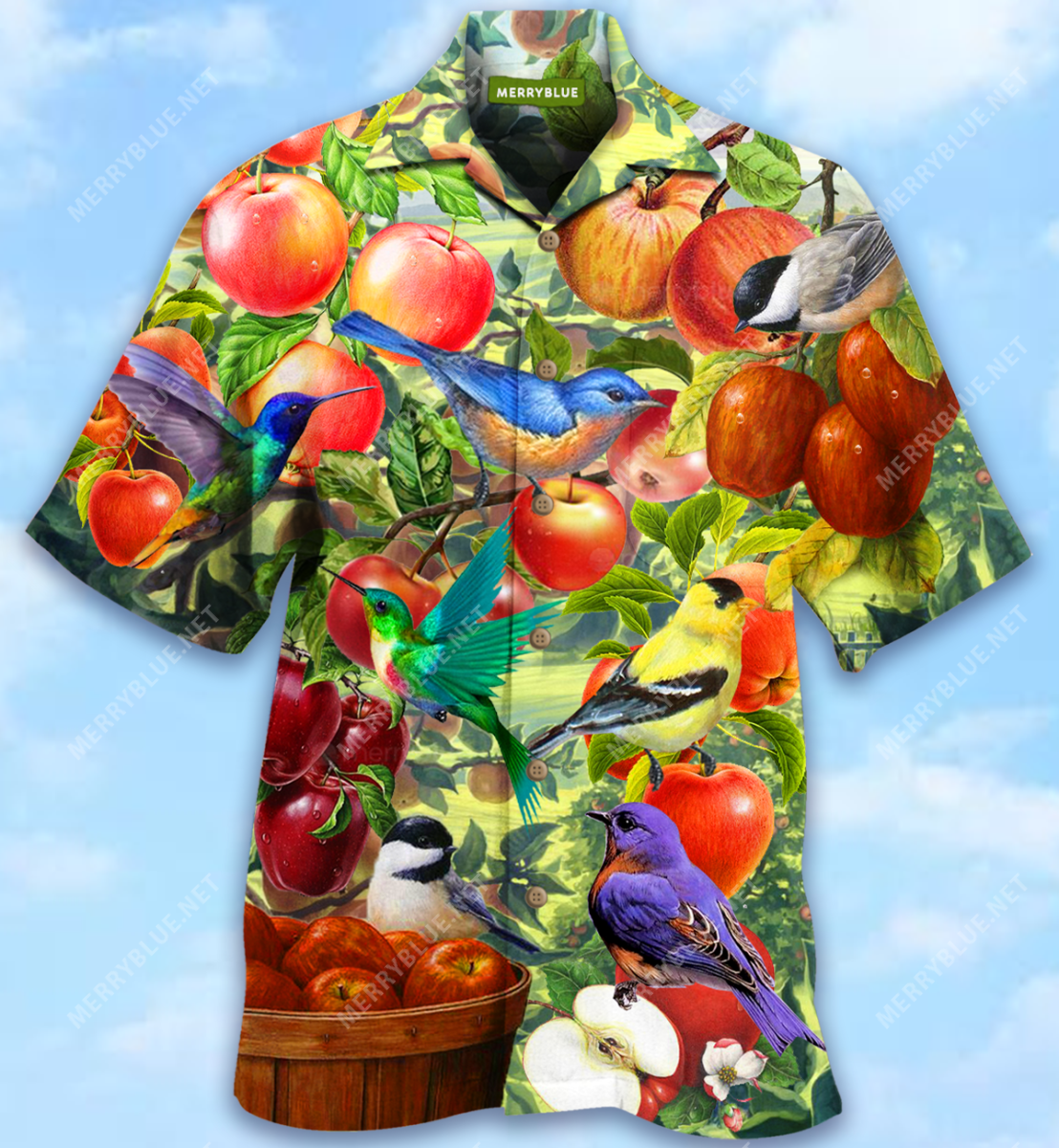 Fresh Apple Garden And Birds Unisex Hawaiian Shirt Bird Lover Fruit Food Pattern Unique Beach Tee S-5XL