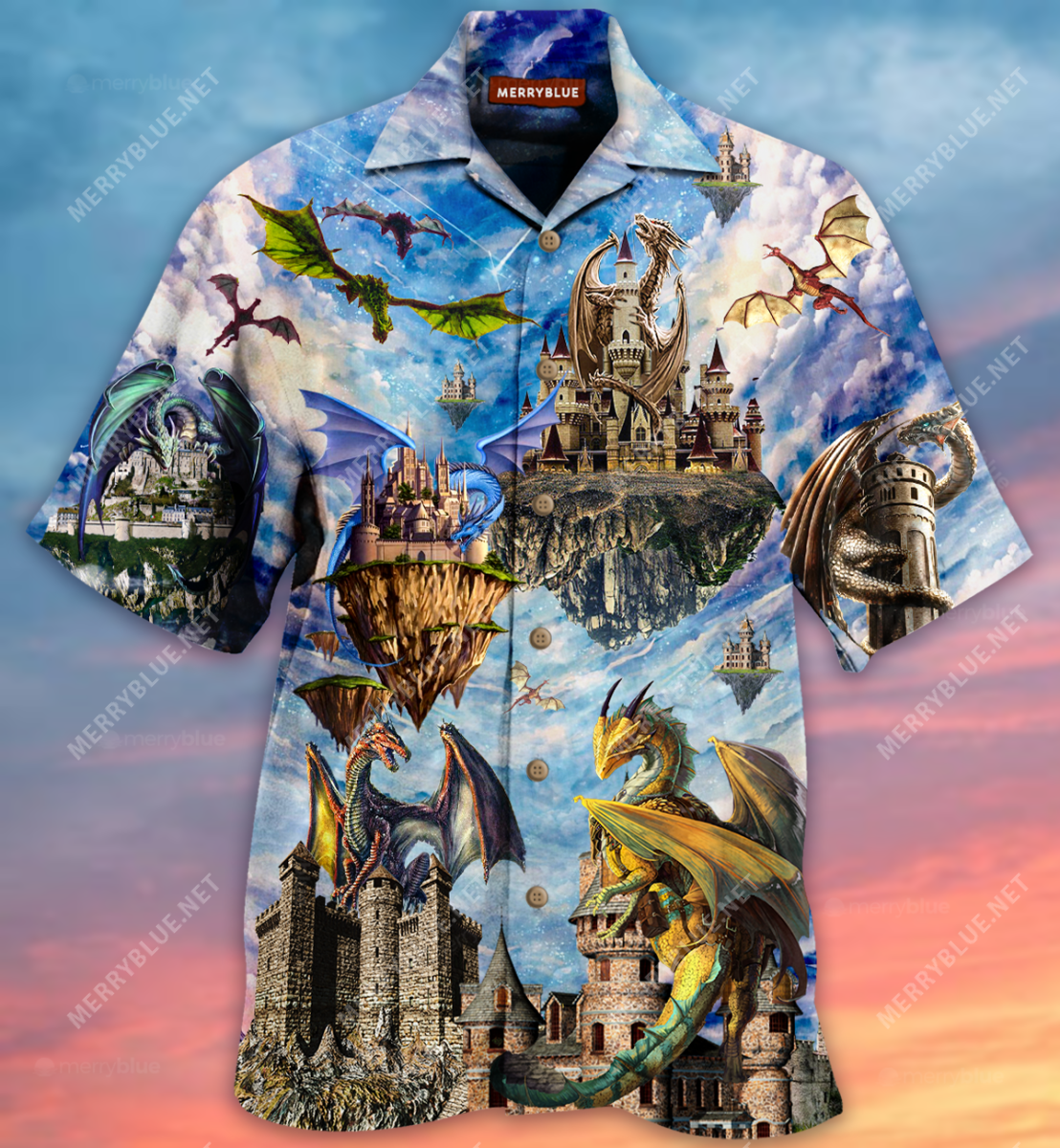 Fantasy Dragon Castle In The Sky Unisex Hawaiian Shirt Summer Vacation Tee Gift